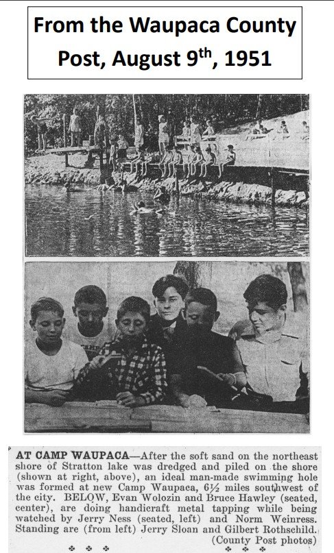 I would bet that most of you who were at camp in the 1950s and 1960s remember seeing an article from the Waupaca County Post (WCP) pasted to a wall in the rec hall. By the 1970s and 1980s, it was fading quite a bit but still readable. There is video from the 1996 reunion where Rob Gerowitz goes into the rec hall on film to show the remnants of that article.