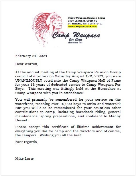 I received your letter & certificate...thank you for the kind words & some exaggerations! Right back at you Guys...you both have my gratitude...I have always appreciated all of your time, hard work, contributions, & sacrifices to keep the Reunion Group where it is today.